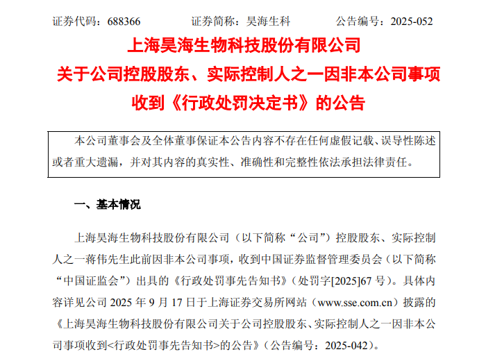 之后,昊海生科又于2025 年9 月17日公告,蒋伟于近日收到中国证监会出具的《行政处罚事先告知书》。
